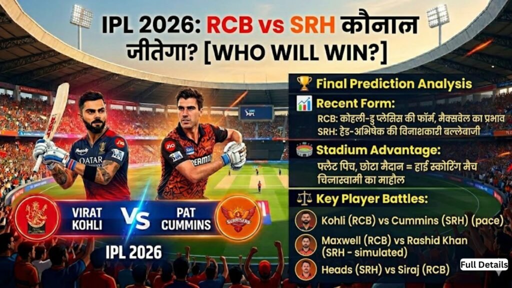 RCB vs SRH IPL 2026 का ओपनर मैच सिर्फ एक मैच नहीं, बल्कि पूरे टूर्नामेंट की झलक है। H2: घरेलू मैदान, हाई स्कोरिंग पिच, दोनों टीमों की स्टार प्लेयर्स – सब कुछ मिलकर एक धमाकेदार शाम बनाने वाला है।