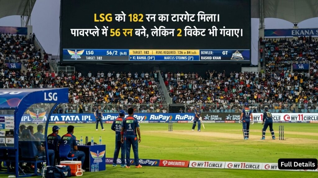 LSG को 182 रन का टारगेट मिला। पावरप्ले में 56 रन बने, लेकिन 2 विकेट भी गंवाए।