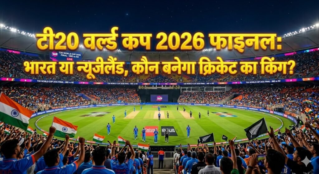 क्रिकेट के दीवानों के लिए एक बड़ा पल आ गया है! टी20 वर्ल्ड कप 2026 का फाइनल मैच भारत और न्यूजीलैंड के बीच होने वाला है। यह मुकाबला 8 मार्च 2026 को अहमदाबाद के नरेंद्र मोदी स्टेडियम में खेला जाएगा। भारत अपनी टाइटल डिफेंड करने उतरेगा, जबकि न्यूजीलैंड अपना पहला टी20 वर्ल्ड कप खिताब जीतने का सपना देख रहा है। (टाइटल डिफेंड का मतलब: पिछली बार जीता हुआ खिताब बचाना।) यह मैच न सिर्फ दो टीमों की जंग है, बल्कि दो देशों के लाखों फैंस की उम्मीदों का भी। क्या भारत घरेलू मैदान पर राज करेगा या न्यूजीलैंड फिर से ‘ब्लैक कैप्स’ की तरह काला जादू दिखाएगा? आइए, इस मैच प्रीव्यू में गहराई से जानते हैं। यह लेख भारत बनाम न्यूजीलैंड टी20 वर्ल्ड कप फाइनल 2026 पर आधारित है